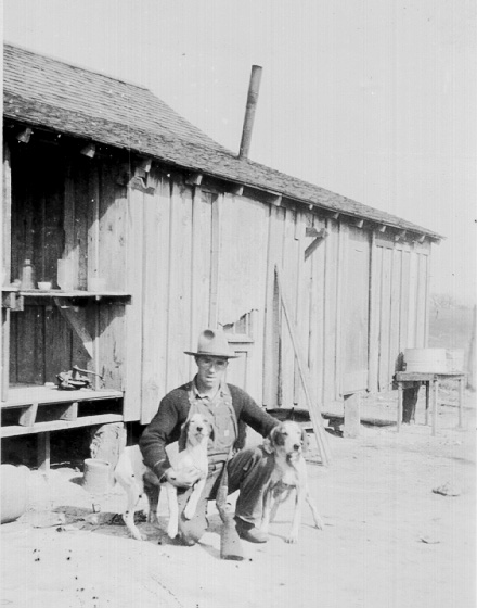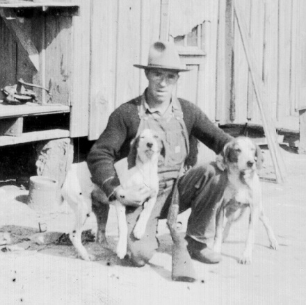 Allen with his hound dogs in front of his childhood home