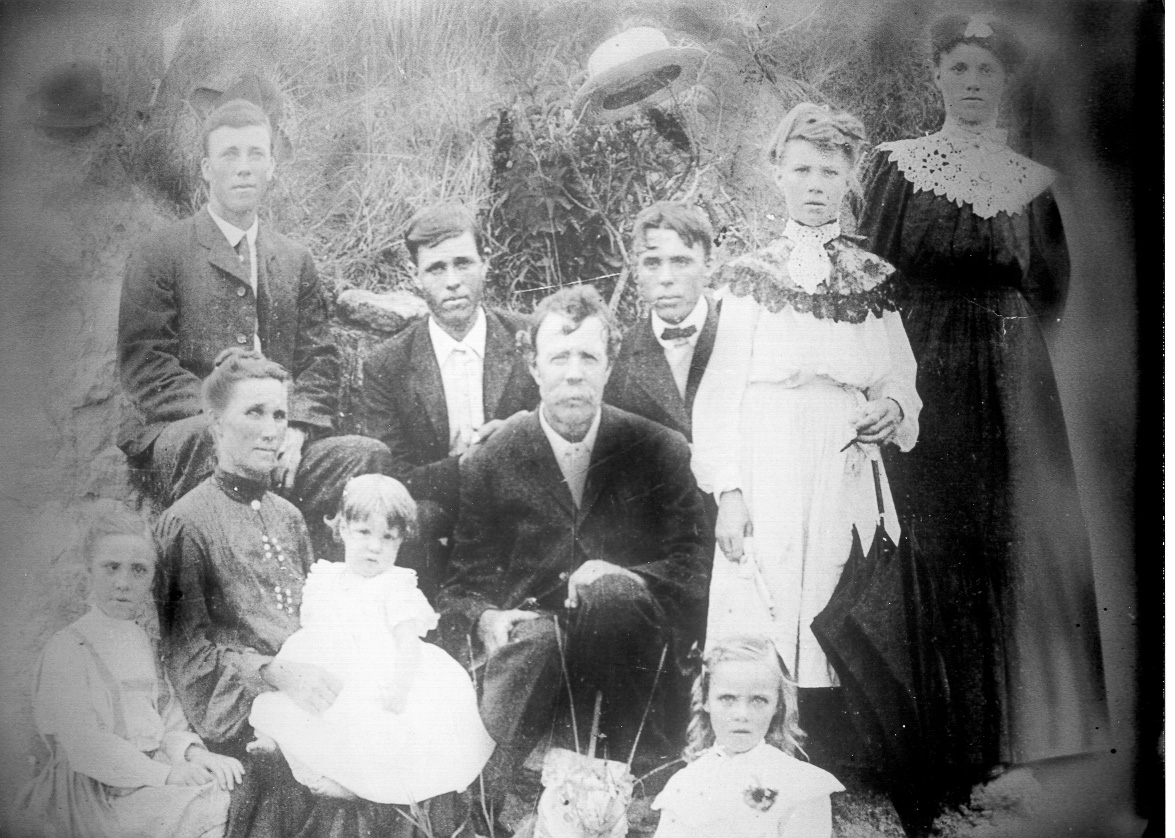 Henrietta Sophia Augusta (Pruetz} Rakestraw (holding baby Mattie) and William Henry Rakestraw (in the center) with their children (back row from left): Fred, Perry, Frank, Ellen, and Annie (front row from left): Agnes (Allen Midgett's mother) and Lenore ("None")