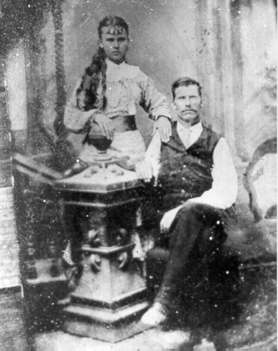 Sarah Francis Aldridge (14) and William Abbott Midgett (32) at their wedding August 5, 1883 in Bellton, Bell County, Texas. Sarah was given to W.A. Midgett by her Cherokee mother who asked only two things: that he be good to her and that he not let her sign the Indian roles.