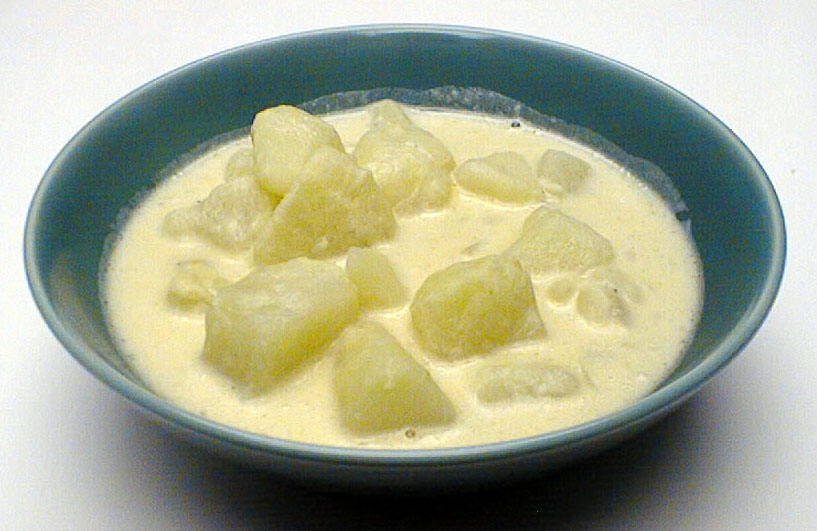 If you are using unpeeled potatoes in your soup, be sure that the skins are thin and very, very clean. Trim away any black or deformed spots. Cut potatoes in 1 inch chunks. Place in a large pan, cover with water and bring to a boil. Boil about 20 minutes until tender when tested with a fork. If you wish, you can saute the onions briefly in butter just enough to make them limp. When the potatoes are done, drain away most of the water leaving about 2 cups in the bottom of the pan. If using milk, drain away all the water. Add condensed milk (or other milk or cream). Add butter, onion, salt, garlic salt and black pepper. Reduce heat, cover and simmer for about 10 minutes.
