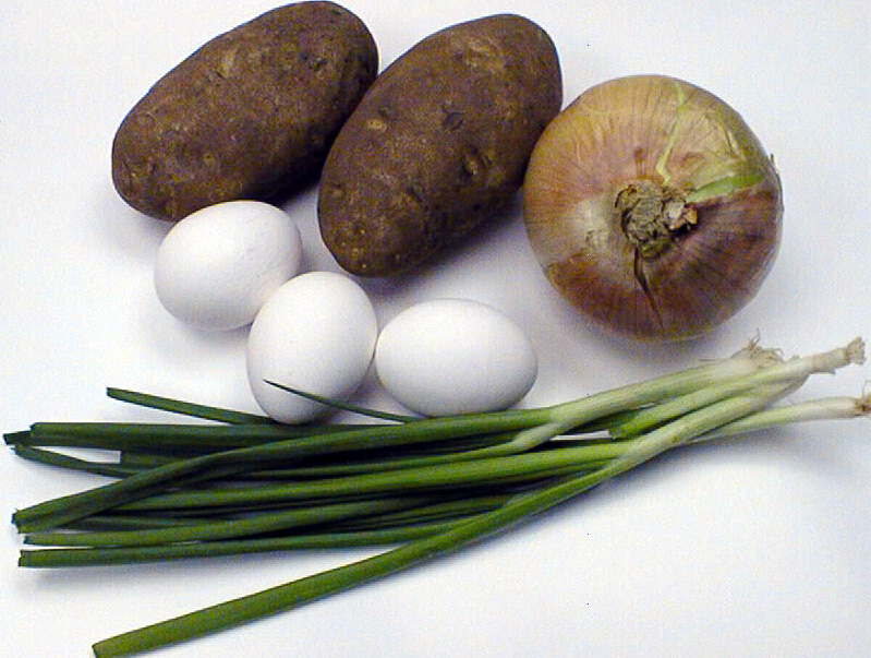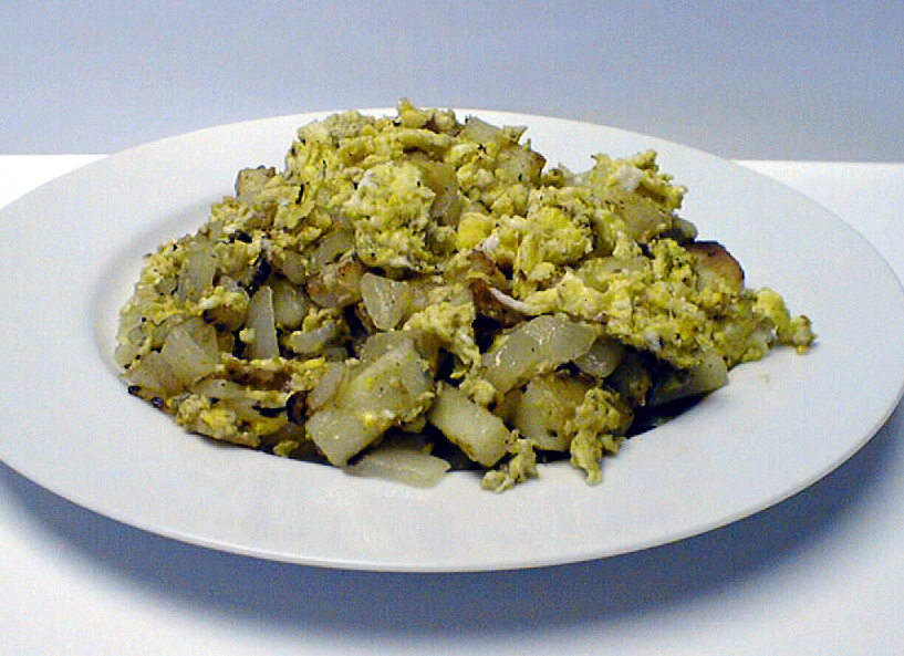 Heat grease in a large cast iron skillet until hot. Add potatoes to hot skillet. Cook until potatoes are lightly browned on all sides stirring often. When the potatoes are browned but still a little crisp in the middle, stir in onions. Add a little more oil if necessary to keep the potatoes from sticking too much. Add 1-2 tablespoons of water and cover the pan. The water will instantly turn to steam and soften the potatoes. Let cook covered 2-3 minutes. Remove lid and push the potatoes to the sides of the skillet so that there is a hole in the middle. Add a tablespoon of oil if there is none in the center of the skillet. Use a fork to beat eggs slightly with 2 tablespoons of water. Pour eggs into the center of the skillet. Keeping the eggs in the center, stir until they are scrambled. Then stir the eggs throughout the potatoes and onions. Add black pepper and salt to taste and serve. Let each person add ketchup to taste.