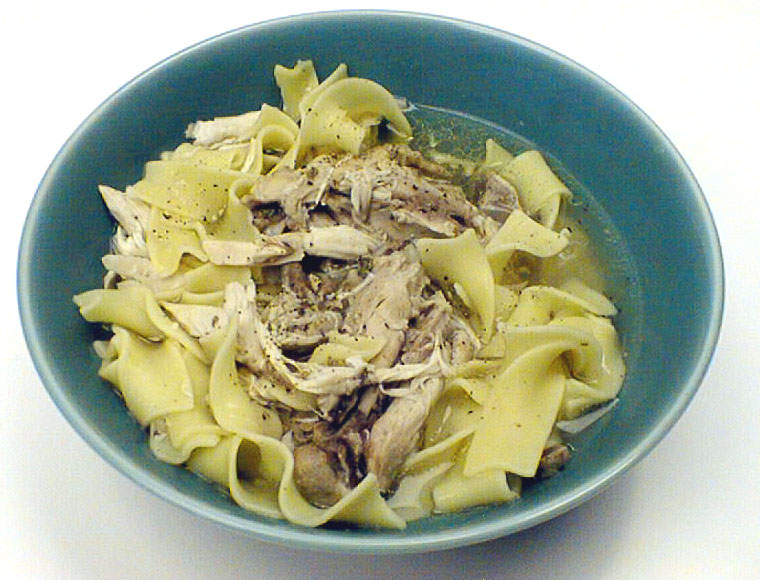 Cut up chicken. Put in slow cooker and cover with water to about two inches above the chicken. Add 1 teaspoon salt. If desired, add poultry seasoning. Set slow cooker on high and cook chicken until very tender (about 3-4 hours). When chicken is done, add package of noodles and cook on high for about 20 minutes. Be sure the water covers the noodles. Push them down in the broth and add a small amount of hot water if necessary. Add lots of black pepper. Remove from cooker when done or the noodles may become very mushy.
