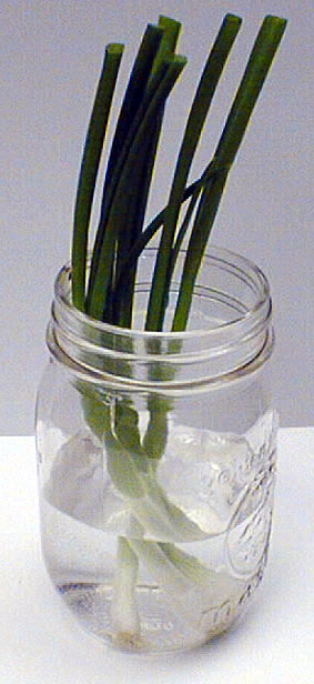 Wash thoroughly. Remove bad leaves from the tops. Remove the outside layer of onion from the bulb. Cut off just enough of the onion tops to remove any scraggly ends. Place in a jar or glass with water. Cut off the roots just before eating.