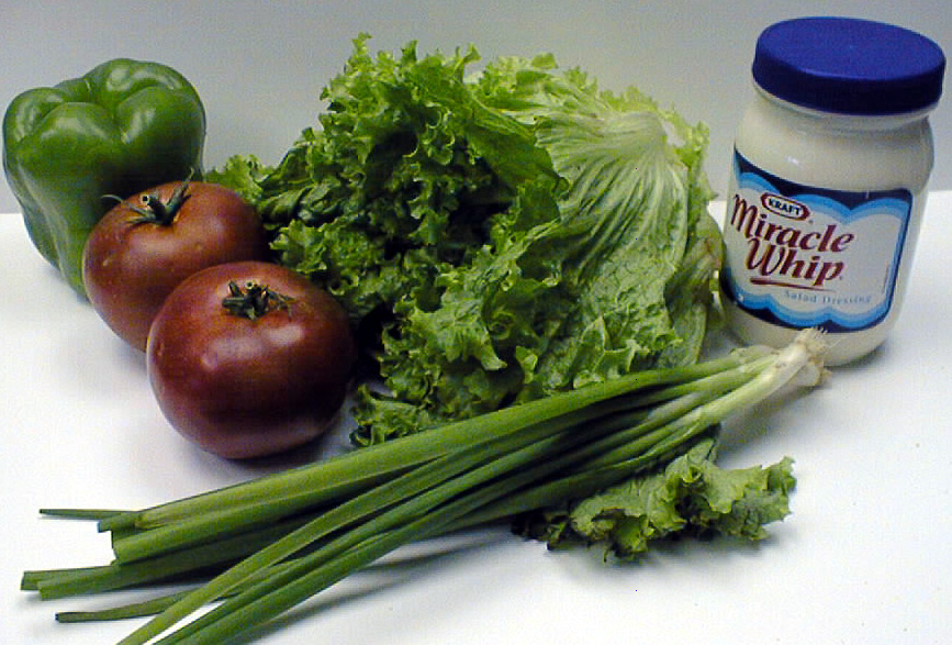 Wash lettuce under running water. Remove bad leaves and cut out core. Dry leaves by shaking or spinning (with a salad spinner) water out of leaves. Leaves can also be patted dry with a paper towel. In a large bowl tear lettuce leaves into large bite-size pieces. Wash other vegetables. Remove core from tomatoes and slice into bite-size pieces. Remove core from bell pepper including all white fibers inside. Cut into thin strips. Clean onions and chop into 1/4 inch pieces. Clean carrots cutting off both ends and cut into very thin (less than 1/4 inch slices). Dressing can be added to the salad as a whole just before serving or it can be placed on the table for each person to add as desired.