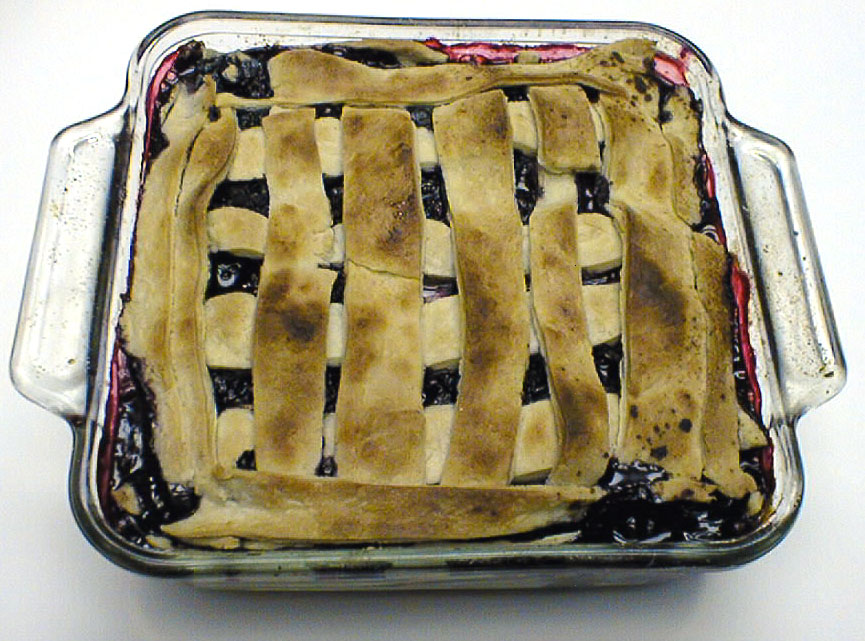 Mix the sugar and salt. Place 1/2 of fruit in pan on top of the dough. Sprinkle with sugar and salt. Place pats of butter on the layer of fruit. Place the second layer of fruit in the pan and sprinkle it with salt and sugar. Place pats of butter on the fruit. Cut strips of dough and place across the top of the pan in one direction. Place another set of strips of dough across the pan in the other direction. Or have a little fun and place the strips of dough diagonally across the pan. Bake 40 to 50 minutes. Both crusts should be golden brown.