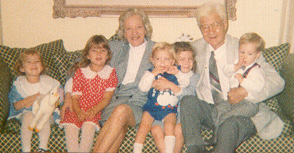 Goldie and Frank J. Purcell with their grandchildren (left to right): Carlie Mills, Jennifer Mills, Goldie Purcell, Bates Purcell, Simpson Purcell, Frank Purcell and Brian Mills